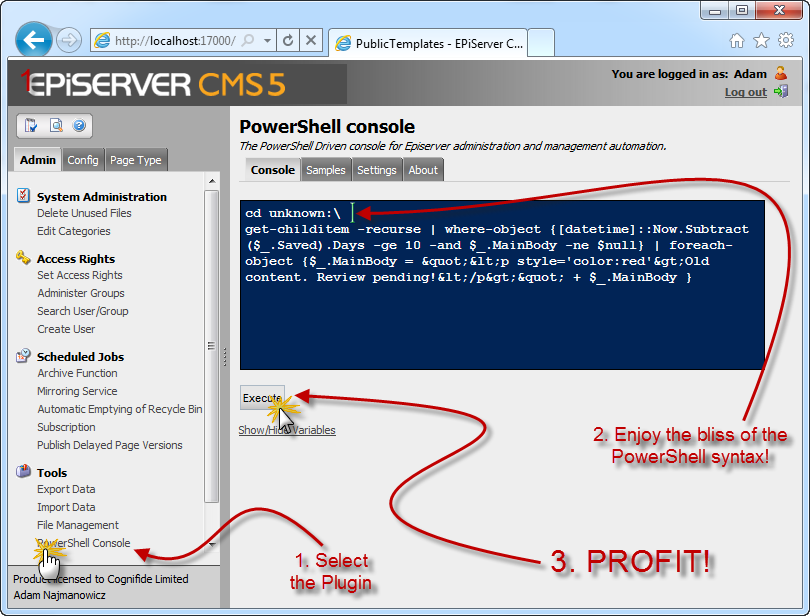 The idea is to create a scripting environment to work with EPiServer on a more granular level than the existing PowerShell SnapIn API enables us currently. Manipulate not just sites, but files and pages on a large scale or perform statistical analysis of your content using a familiar and well documented query language.