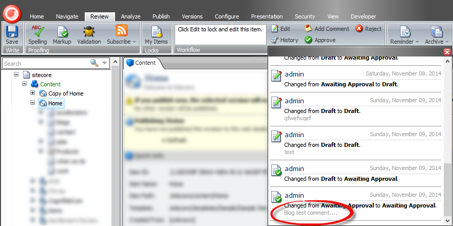 Now let’s see how this behaves in action: Given I have my item in the Avaiting Approval state, when I click the Add Comment command (1) then I will see the PowerShell runtime popup (2) and ask me for the comment to be provided (3). When I provide the comment and click OK (4) the comment will be added.