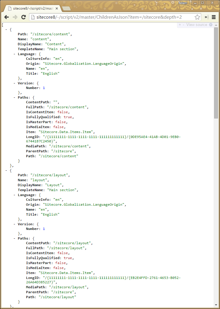 If you’re already working as a logged in user there is n need to provide credentials and you can work with all databases that are available to your user group, however if you’re not authorized you can place 2 additional parameters: user and password to provide the missing credentials. So the above URL can look as follows: http://hostname/-/script/v2/master/ChildrenAsJson?item=content&user=admin&password=b which will result in a request authenticated as the standard Sitecore admin.