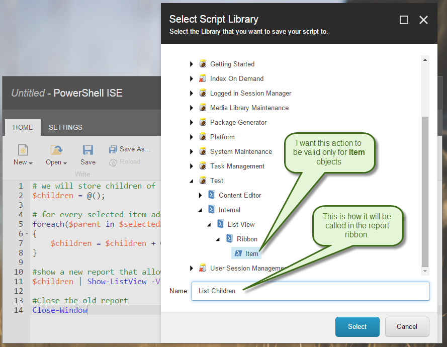 You define an action as a script located in an SPE script library and appears in the Actions panel. In the simplest scenario the action would appear when the script library name matches the .Net class name of the items displayed. In the above scenario the actions are placed under /Platform/Internal/List View/Ribbon/Item/ where Platform is the module and Item is a script library. Let’s take a look at the script here /Platform/Internal/List View/Ribbon/Item/Open