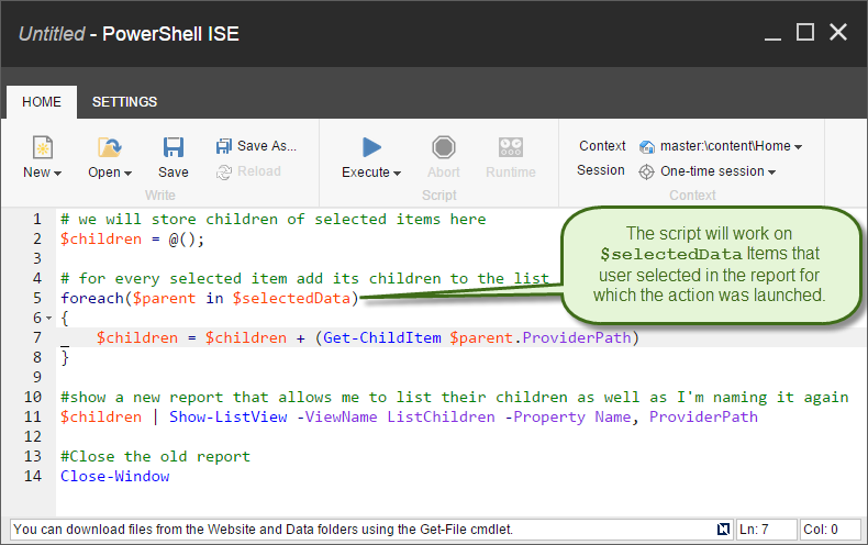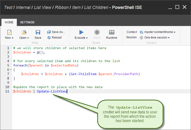 Confirm the save on all dialogs to persist your changes. Now our action appears when we run this script in ISE.
