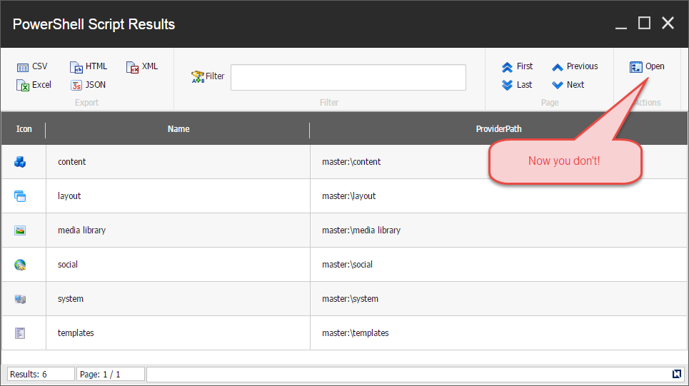 1Get-ChildItem master:\ | Show-ListView -ViewName ListChildren -Property Name, ProviderPath
