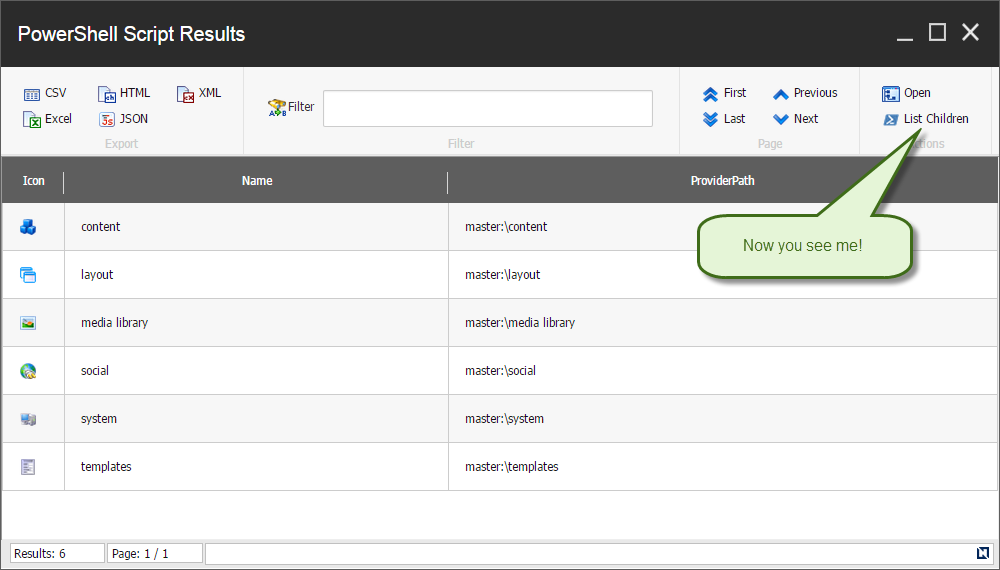 1Get-ChildItem master:\ | Show-ListView -ViewName ListChildren