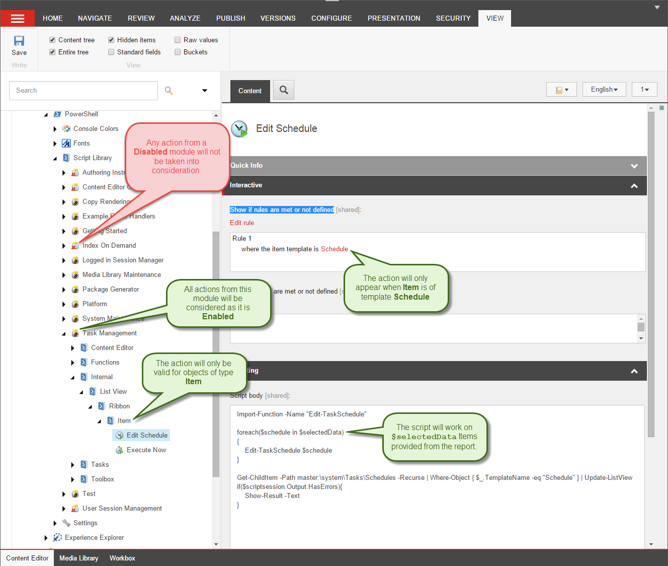 Rules add the full power of the Sitecore rules engine - similarly to what you can do on context menu items or ribbon actions in Content Editor like I’ve described in my previous post. Some examples where this can be useful include only enabling or disabling the action for items located under a specific branch of the tree or if a persistent session exists.