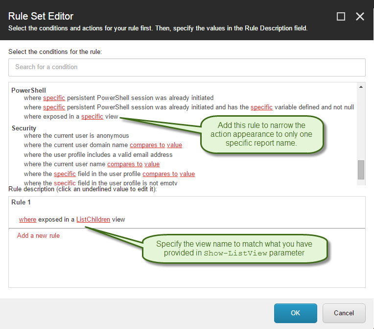 Show-ListViewthat are of the type based on location. Rules will provide more granular control and allow for rule-based conditions that determine action visibility.