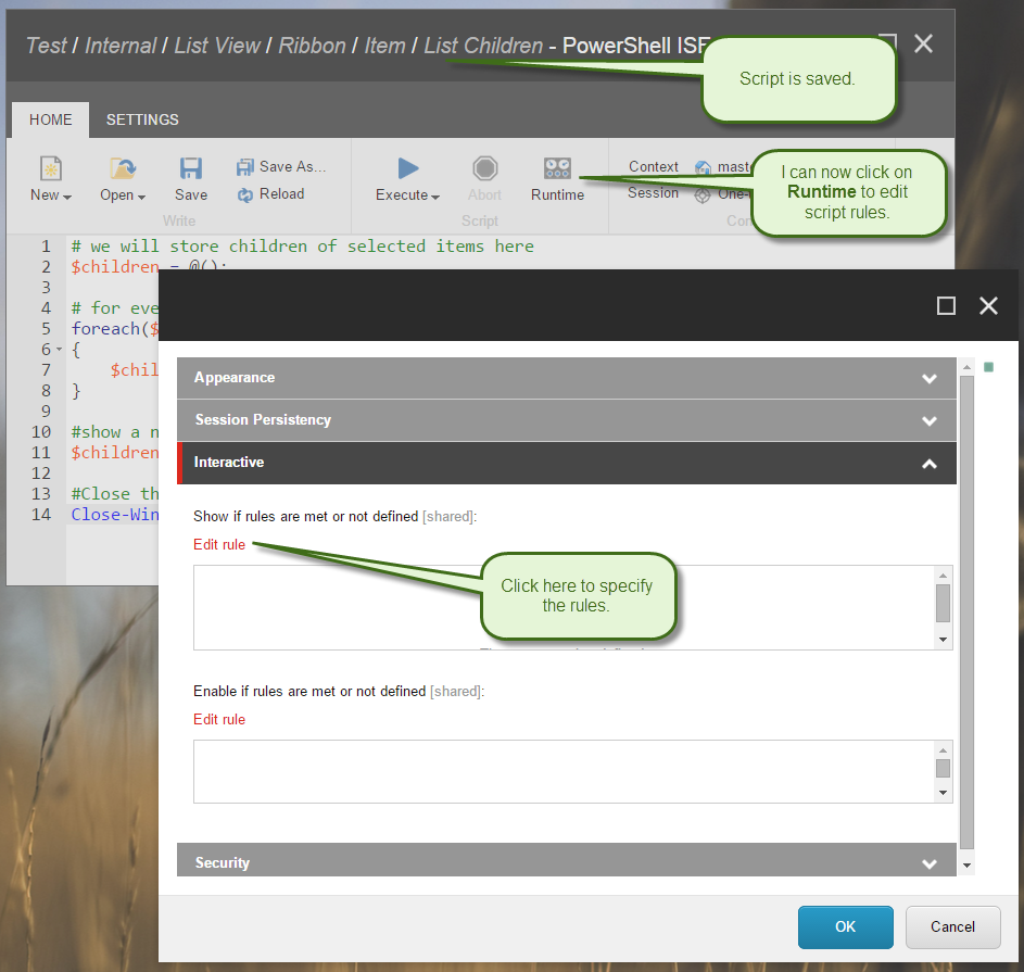 At this point my action will show on all reports what list Item objects. But now that my script is saved I can modify its rules to narrow it down only to Show for reports named “ListChildren”. For this I can click the “Runtime” button in the ISE ribbon and edit the “Show if rules are met or not defined” field.